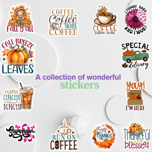 Designs include: Pumpkins, Leaves, Coffee Mugs, Trucks, Pink Ribbons, and Funny Coffee Quotes.