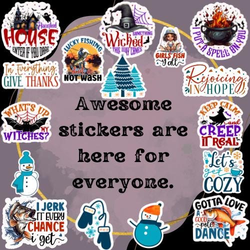 "Check out this awesome variety of stickers! Featuring fun designs for Halloween, fishing enthusiasts, winter lovers, and more, this collection truly has something for everyone. Perfect for decorating planners, laptops, or sharing digitally!"